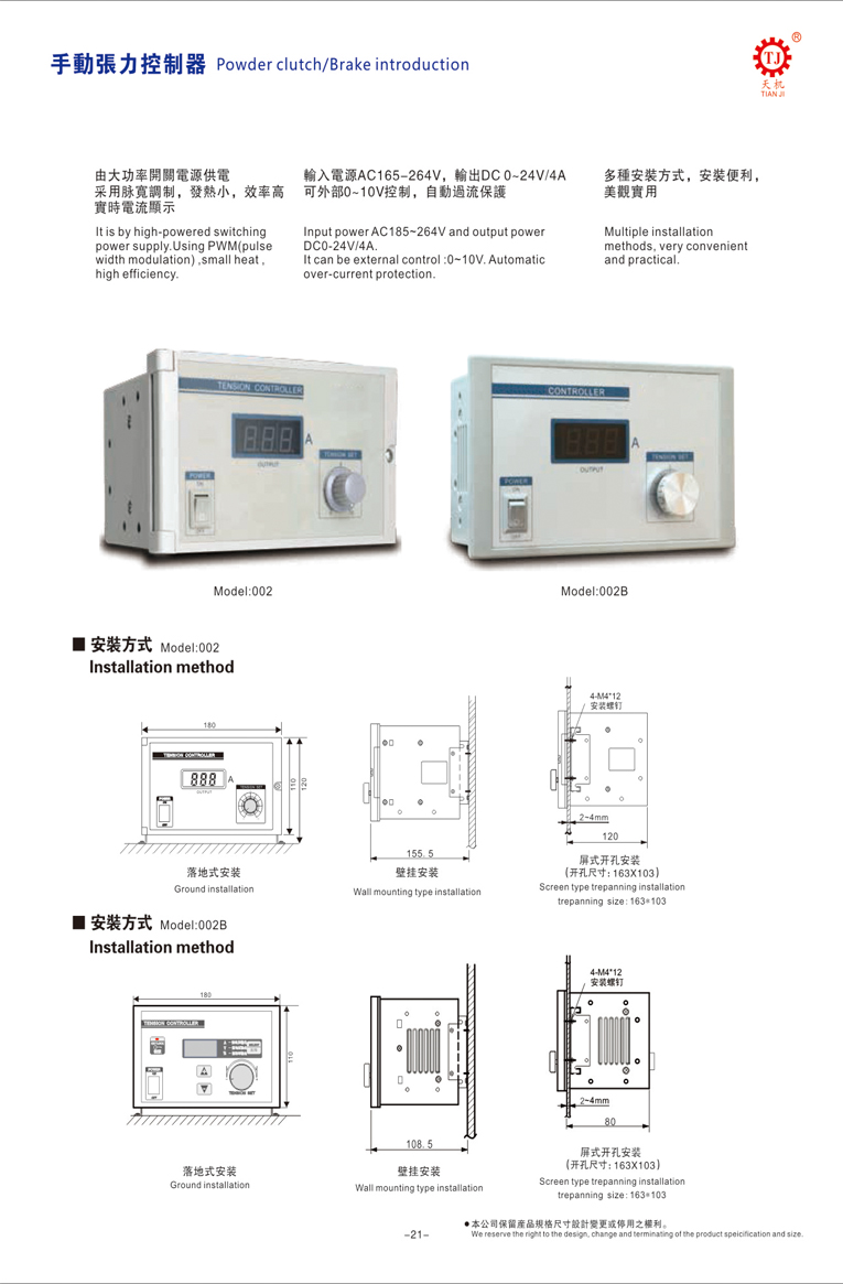 手動張力控制器就是在收卷與放卷時伴隨著卷徑的變化,分階段地對天機磁粉離合器與天機磁粉制動器的勵磁電流進(jìn)行手動調(diào)整以得到張力的控制方式。此外,希望利用可編程控制器D/A變換器等裝置控制天機磁粉離合器與天機磁粉制動器的勵磁電流時,可以直接把外控電壓(0~10V)接入手動張力控制器,然后進(jìn)行自動控制。
