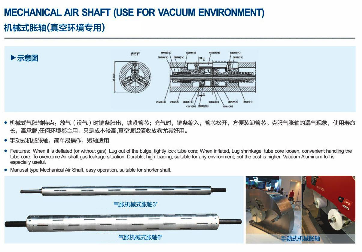 1、充氣作業(yè)時間短,氣脹軸與紙管的分離與放置只需3秒鐘就可完成充氣與放氣,也不需分懈軸端側(cè)的任何零件即能緊密的與紙管咬合。
