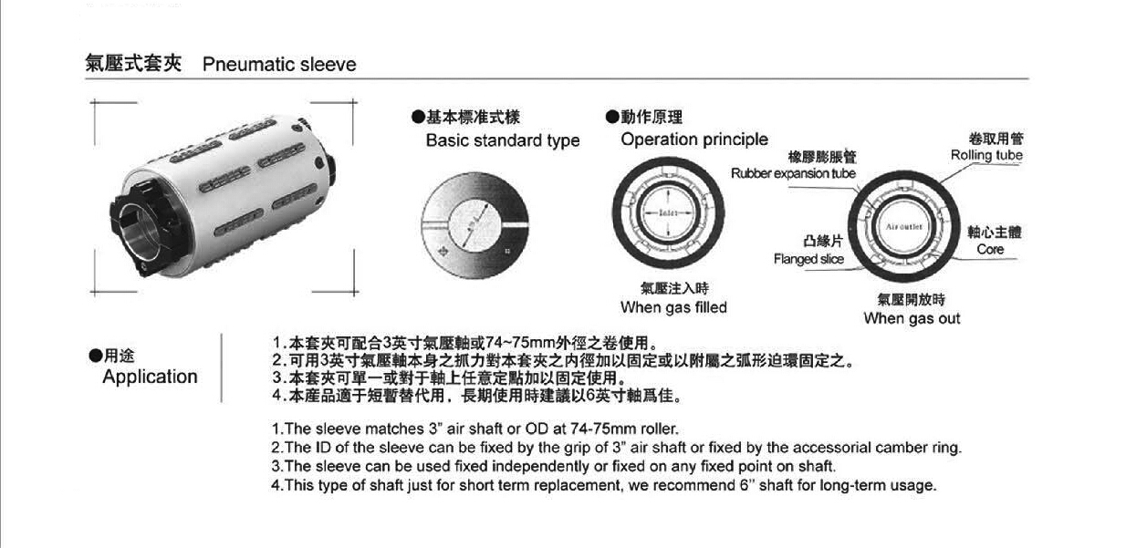 鍵式氣脹軸套夾廣泛應(yīng)用于:分條機(jī)、模切機(jī)、復(fù)卷機(jī)、紙筒機(jī)、制袋機(jī)、貼合機(jī)、覆膜機(jī)、吹膜機(jī)、發(fā)泡機(jī)、淋膜機(jī)、壓紋機(jī)、造紙機(jī)、無紡布機(jī)、驗布機(jī)、燙金機(jī)等收卷放卷機(jī)械中。