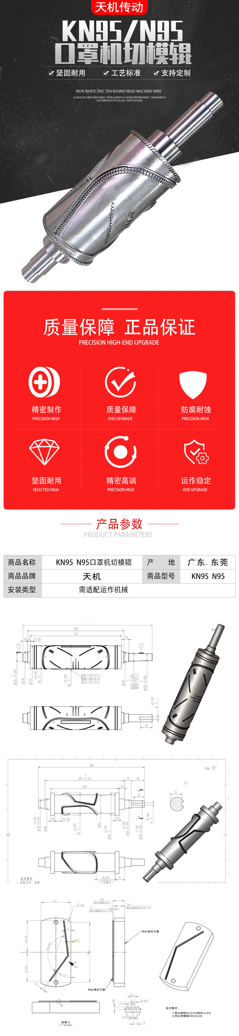 kn95口罩機(jī)配件熔接齒模立體壓花輥滾筒雕花輥模具接熔齒軸主要用于KN95口罩機(jī)生產(chǎn)KN95口罩,也叫KN95熔接齒模、雕花壓花齒模、壓花滾筒、KN95滾壓花輥等等,可以快速的在無紡布、絨布等口罩制作材料上,滾花裁切一次成型,是KN95口罩設(shè)備機(jī)械的關(guān)鍵零部件。