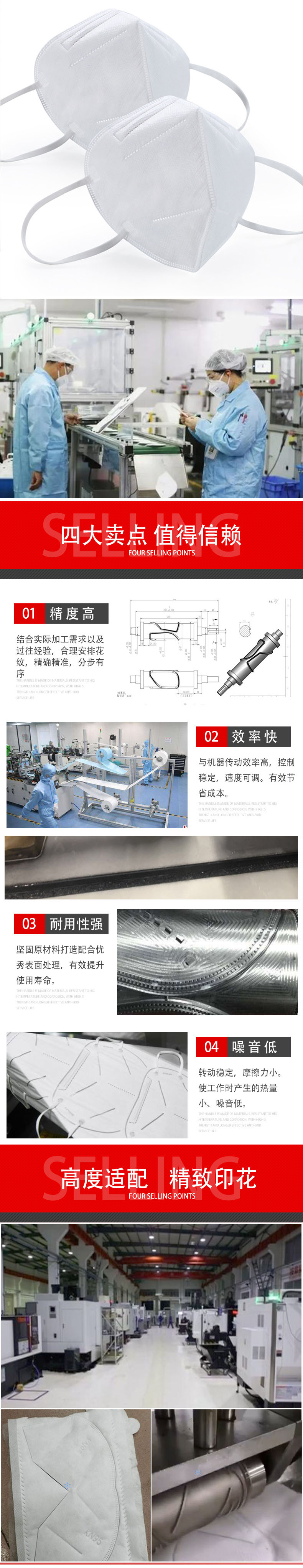 3、kn95口罩機(jī)壓花輥轉(zhuǎn)動穩(wěn)定,摩擦力小讓壓花輥產(chǎn)生的熱量小、噪音小、使得壓花輥壽命更長、省電、形成的花紋平滑細(xì)膩明顯等效果;N95口罩機(jī)壓花輥加工時所產(chǎn)生的噪音值約減少30DB-50DB。